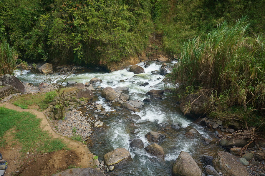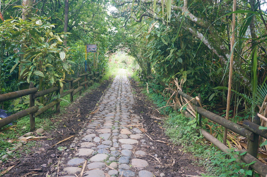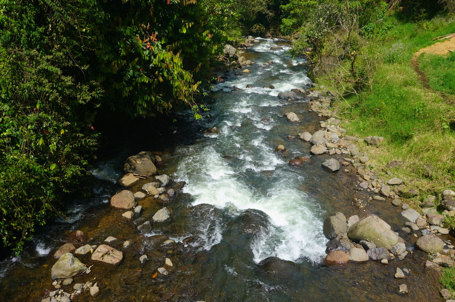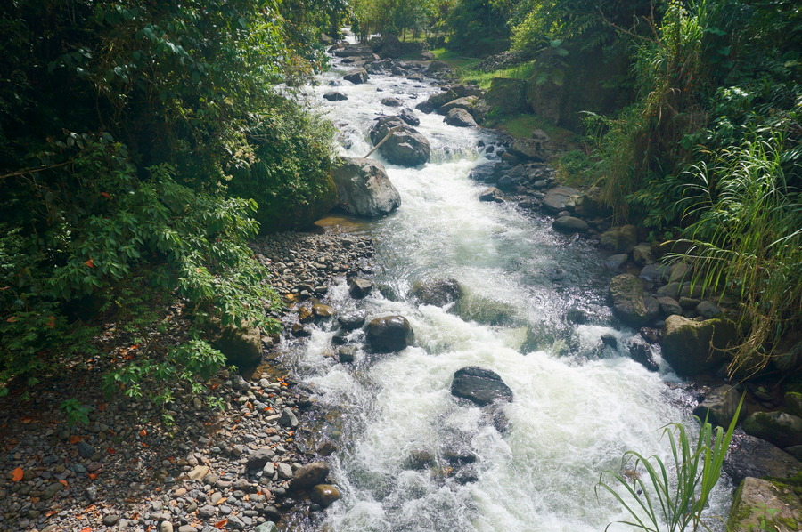 Cette fois, nous avons tiré des leçons de nos erreurs et nous avons commencé notre petite rando directement depuis le village en montant à pied. La Herradura est un chemin muletier construit à la fin du XIXe siècle lors de la fondation des villages de l’Eje Cafetero. C’était la toute première voie d’accès entre les départements de Antioquia et de Caldas. Le chemin est super facile, en partie sur la route, et pas très raide. Il n’y a pas la superbe vue comme celle depuis le Café Jardín ou le Cristo Rei mais nous avons quand même préféré cette balade à celle de la veille. La flore et la faune sont plus intéressantes et il y a de nombreux points d’eau comme des petites cascades ou encore le Charco Corazón, une belle rivière tumultueuse, que nous suivons un pendant une partie de la marche.