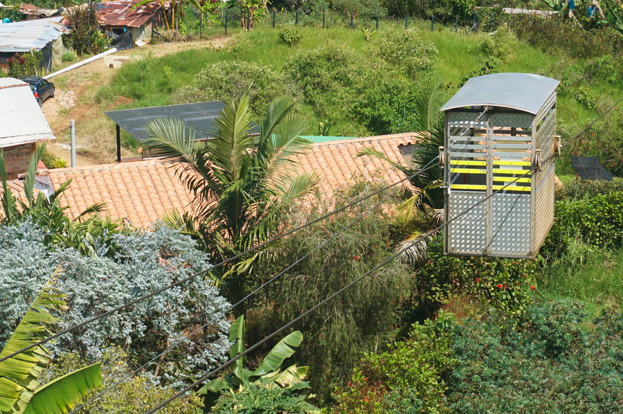 Après cette petite marche bien sympa, il faut songer à redescendre au village. Nous pourrions aisément rentrer à pied mais nous voulons quand même expérimenter le transport local : la garrucha. C’est une petite cabine un peu branlante tenue par deux câbles qui traverse la vallée. A la base, la garrucha était un moyen très pratique pour transporter les marchandises comme les bananes ou le café des fincas dans les montagnes jusqu’au centre du village. Aujourd’hui, on y accepte les passagers dans un but purement touristique même si les marchandises y sont toujours transportées.
