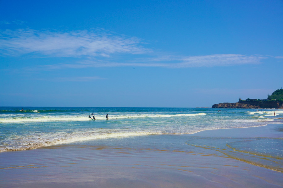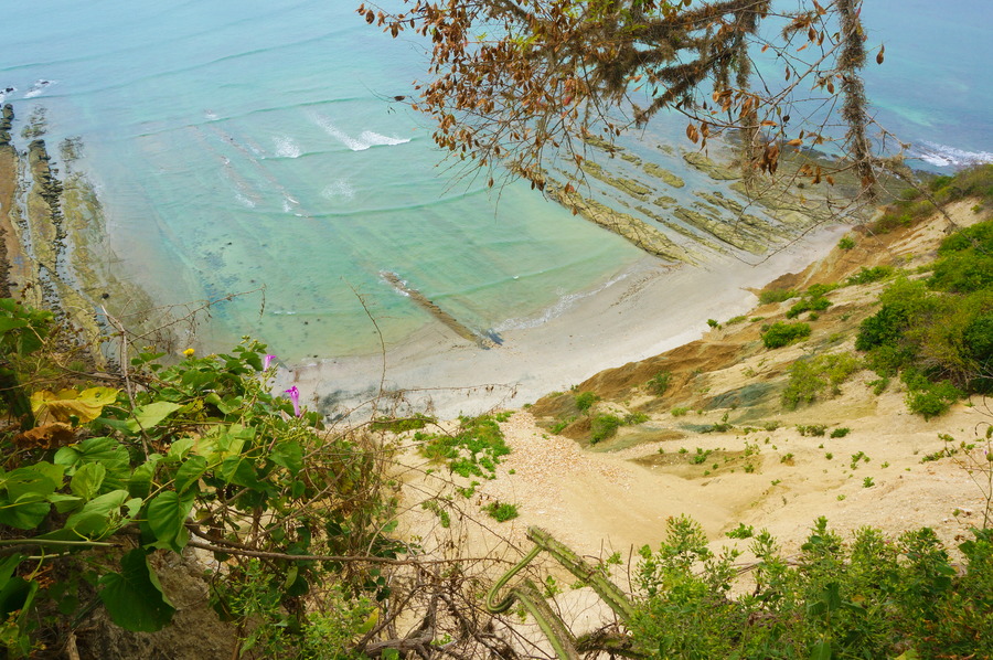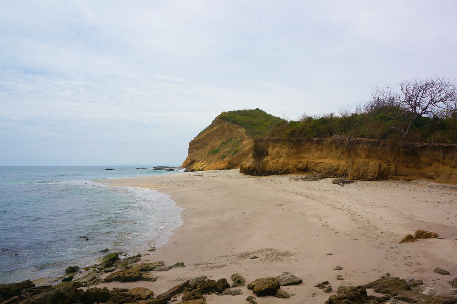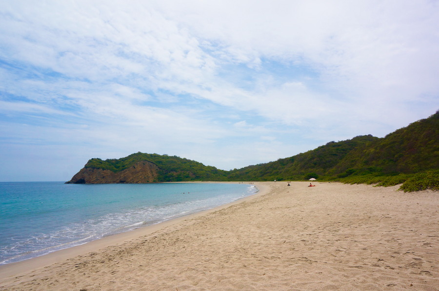 Nous nous situons dans le parc national de Machalilla auquel appartient la plage de Los Frailes. Avec une réserve terrestre de plus de 56’100 hectares et une réserve marine de près de 15’000 hectares, c’est le plus grand espace protégé du littoral équatorien. Il n’y a pas d’accès routier, le bus nous laisse au bord de la route au début d’un sentier et il faut marcher une bonne demi-heure pour y accéder. Du coup, la plage et le parc sont très peu fréquentés, et nous avons tout le loisir d’observer les lézards, les papillons et les oiseaux. La plage se trouve dans une baie bien protégée, du coup il y a moins de courant et c’est un peu plus propice à la baignade qu’ailleurs sur la côte.
