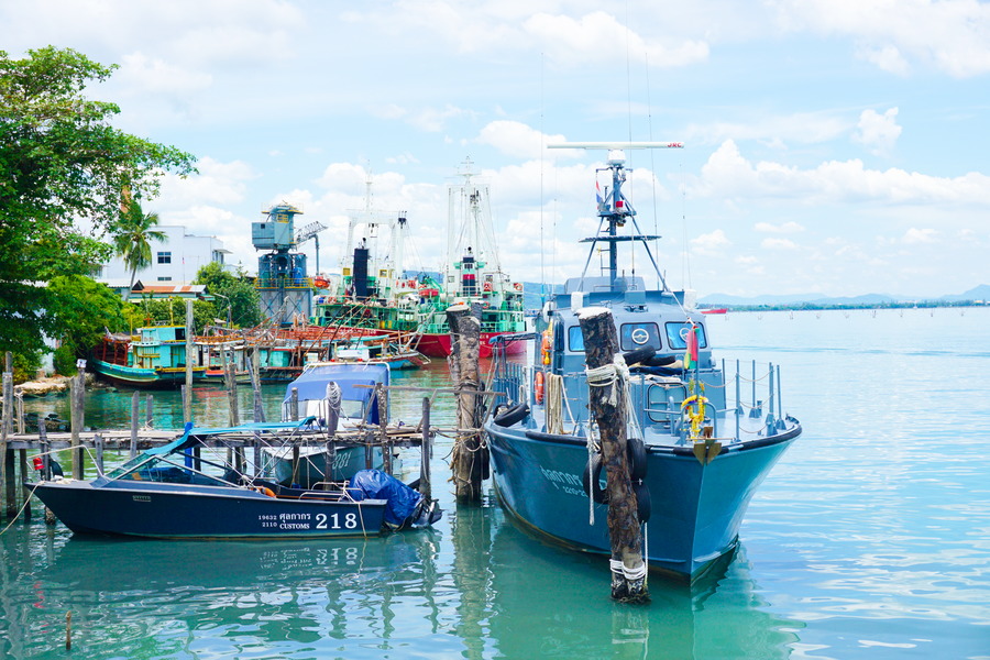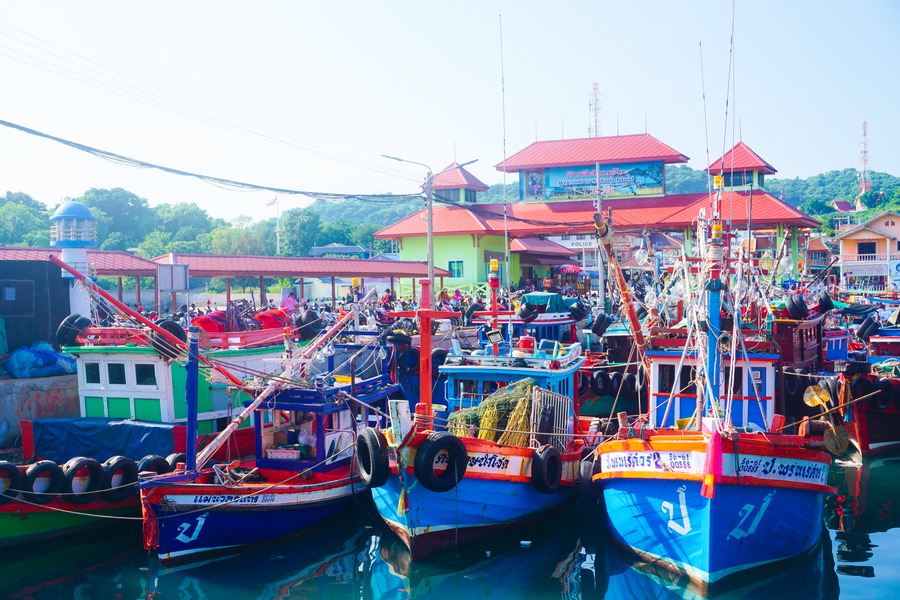 Pour se rendre à Koh Sichang, c’est facile! Il y a un ferry toutes les heures depuis Sri Racha et le trajet dure quarante-cinq minutes, il n’y a pas besoin d’organisation. La traversée se déroule dans la zone portuaire, c’est une vraie autoroute à bateaux. Ce n’est pas très glamour mais ça donne une ambiance particulière au lieu. Nous débarquons dans le seul village de l’île et, bonne surprise, il n’y a pratiquement rien qui est dédié au tourisme. C’est un petit village qui vit au rythme de la pêche, de l’arrivée du ferry et des stands de street food.