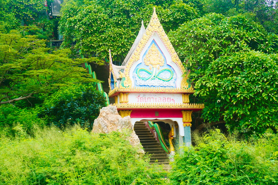 Même dans un endroit touristique, nous restons en Thaïlande , un pays profondément pieux, et de nombreux temples bouddhistes sont disséminés un peu partout sur l’île au bord de la route. Le vert intense de la végétation luxuriante se marie parfaitement avec les couleurs vive des temples.