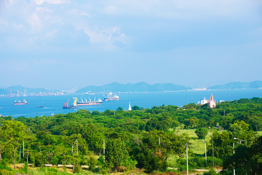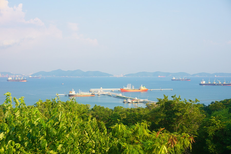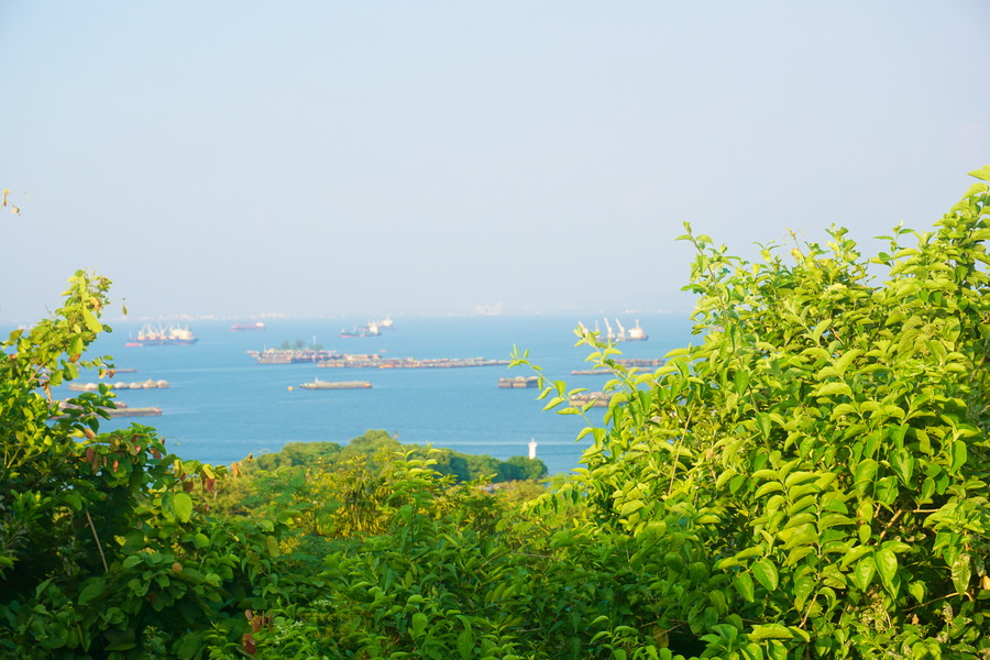 Au sommet, nous sommes récompensés de nos efforts par la vue. Avec l’activité portuaire de la région, ça grouille de navires mais nous pouvons bien apercevoir la côte distante de seulement douze kilomètres.