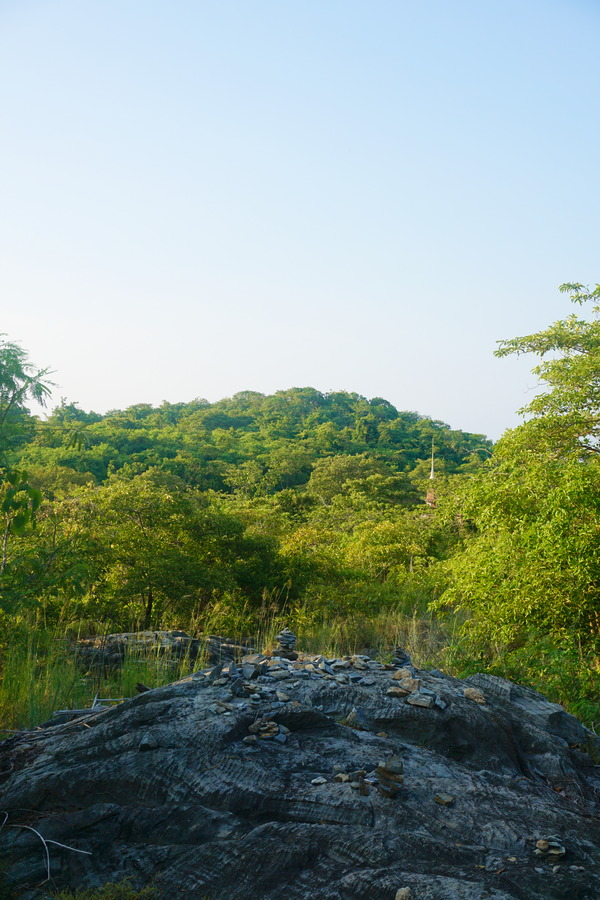 Depuis le parc il y a un chemin entre les arbres qui grimpe sur la colline. Il ne nous en faut pas plus pour nous motiver. C’est parti pour une promenade dans une superbe végétation même si elle est moins luxuriante que prévu, la saison des pluies n’a pas été très forte cette année.