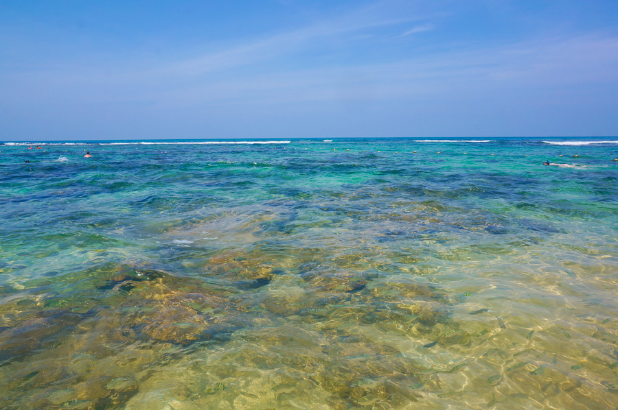 Les photos suivantes ont été prises en surface avec un appareil normal car nous ne sommes pas équipés pour la photographie sous-marine et sont donc de piètre qualité mais vu ce qui se laisse déjà apercevoir, nous vous laissons imaginer les beautés que nous avons pu observer en snorkeling. Et ça, c’est ce que nous avons vu depuis la plage, à quelques centimètres de profondeur!