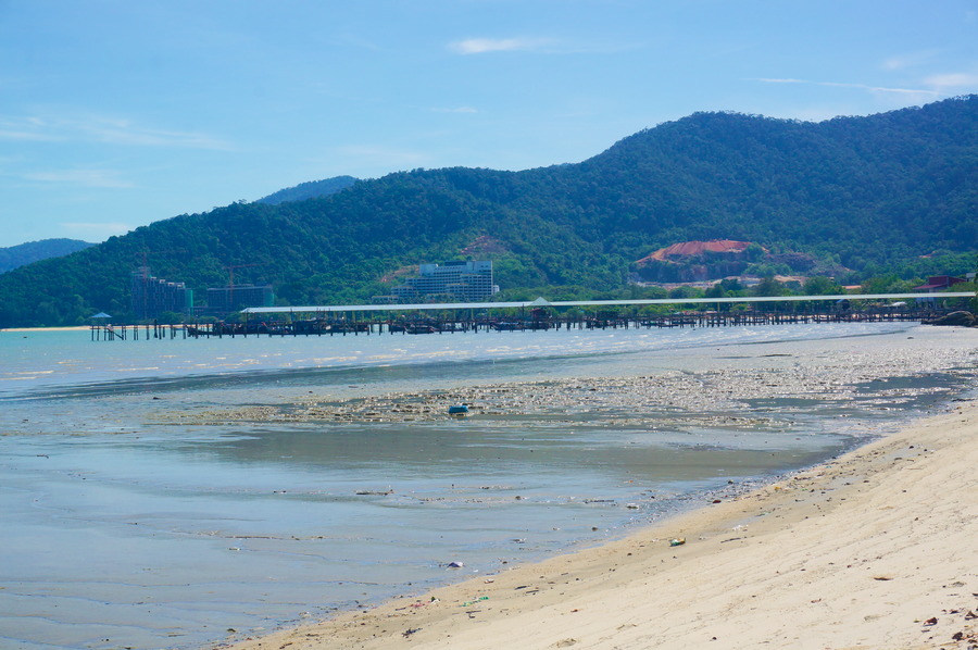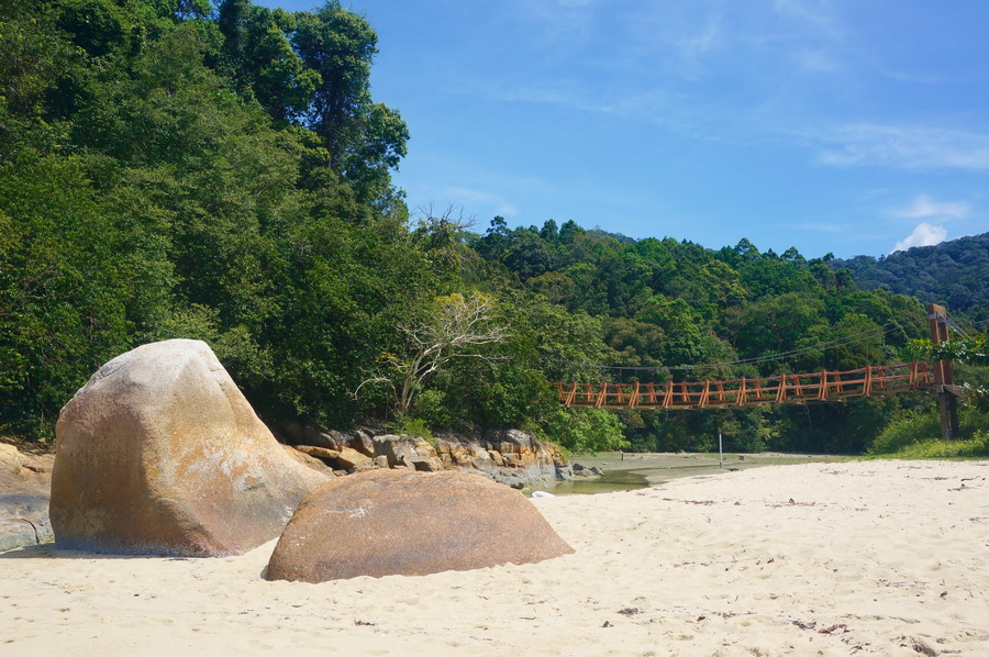 En étudiant la carte de Penang, nous sommes tombés sur une grosse partie verte au nord-ouest de l’île nommée Penang National Park. Il ne nous en a pas fallu plus pour nous motiver! Surtout que le parc est super accessible en transports publics depuis la ville de Georgetown et l’entrée est gratuite! Nous avons donc posé nos sacs à Batu Ferringi, petit village pas très glamour mais relativement proche du parc, avec plein de stands de bouffe (un must!), calme et loin de la frénésie de Georgetown. Il y a même une plage assez calme où l’eau a une température agréable pour la baignade.