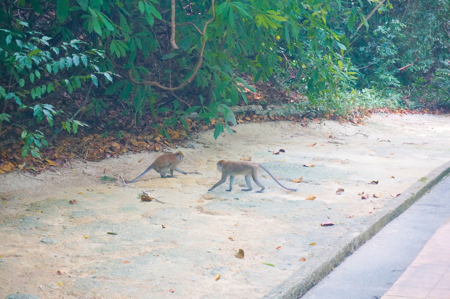 Comme cette balade nous a enchantés, nous décidons de prolonger notre séjour à Batu Ferringi et de revenir dans le parc afin de d’en découvrir une autre partie. La marche est, cette fois, un peu plus courte car une partie du trail est fermée pour maintenance. Par contre, la randonnée est beaucoup plus pittoresque car le chemin suit la mer ainsi que de superbes plages. Les branches ont craqué sur nos têtes presque tout le long de notre promenade. Il faut croire que toute la communauté de macaques du coin ont décidé de nous honorer de leur présence.