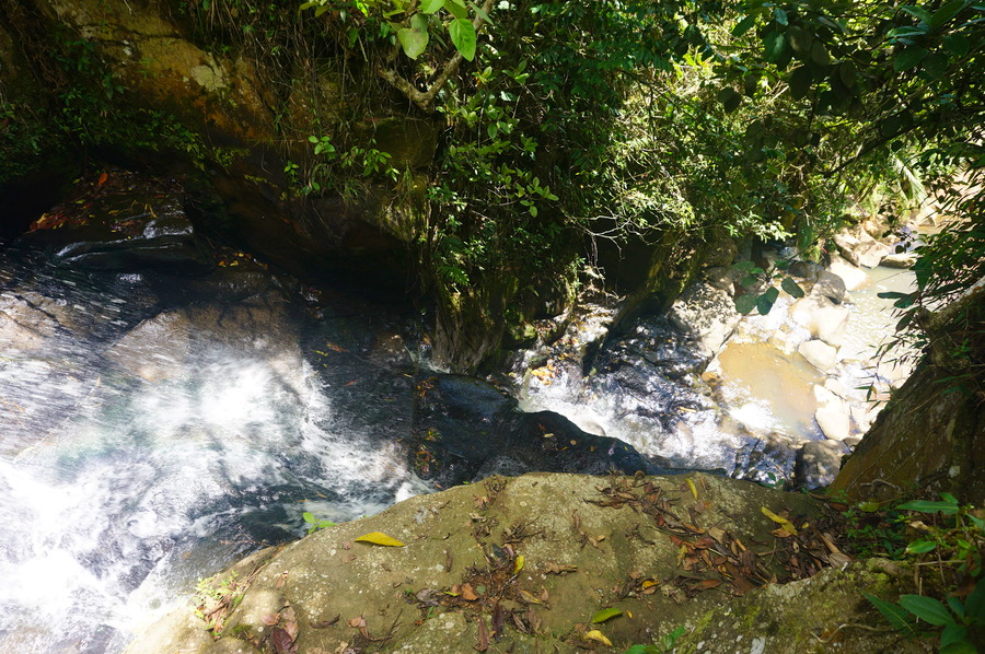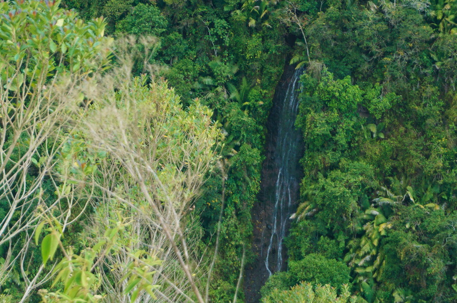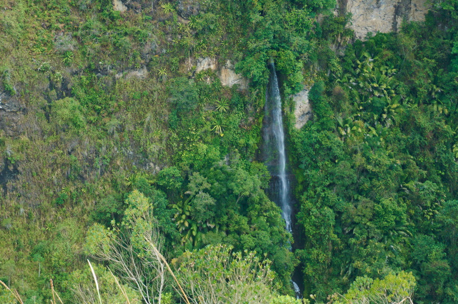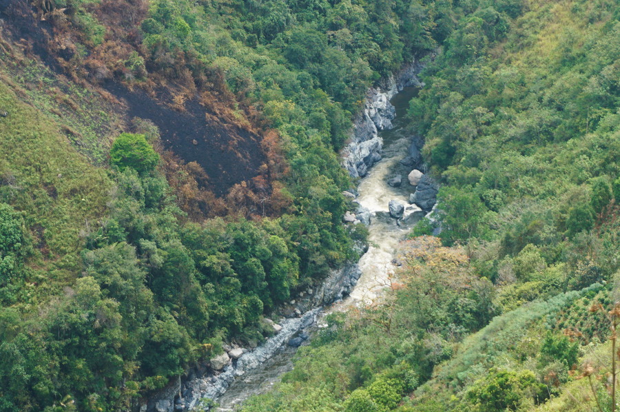 En bas des marches, il y a une petite plateforme avec une superbe vue sur le canyon du Rio Madgalena et sur les différentes cascades qui découpent les flancs des montagnes au milieu de la végétation tropicale bien verte et luxuriante.