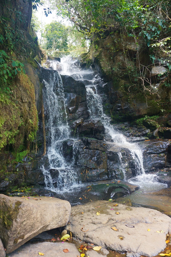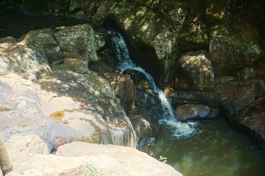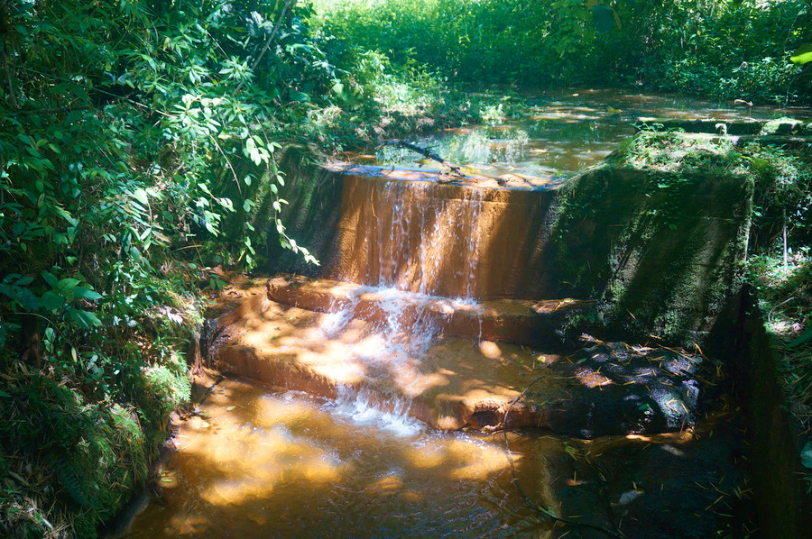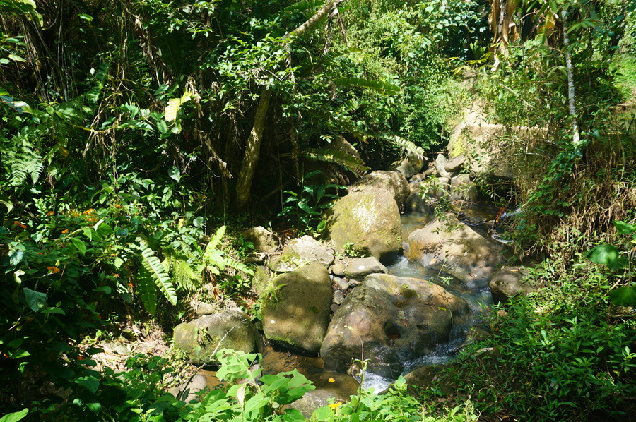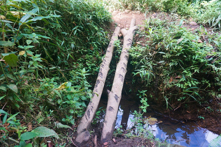 A la base, nous étions partis pour une petite promenade de santé pour nous « reposer » de nos deux marches du jour précédent. Au départ, c’était le cas! Nous sommes partis, cette fois-ci, dans le bas du village en direction du sud-ouest sur une route non asphaltée mais carrossable. Facile, n’est-ce pas? Oui mais ça c’était avant de voir les panneaux qui nous ont indiqué la direction d’une cascade que notre curiosité naturelle nous a poussé à aller voir! Après cinq kilomètres de balade tranquille, nous sommes arrivés à l’entrée du site de la cascade. Nous nous enfonçons donc dans la forêt et, là, ça se corse! Le chemin est un peu scabreux, un peu glissant à cause des pluies de la veille et il faut traverser les cours d’eau sur des ponts de fortune! De bonnes chaussures de marches sont indispensables pour accéder à la cascade!