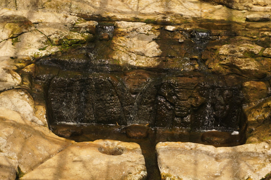 Cette fontaine est un système de canaux sur des pierres gravées avec des figures humaines ou animales. On ne voit plus trop les gravures à cause de l’érosion de la pierre par l’eau. Elle date de l’époque classique (Ier au IXe siècle) et servait de lieu de rituel pour les funérailles. Ce que nous voyons aujourd’hui n’est qu’environ un tiers de toute la fontaine, le reste est resté enfoui sous la végétation.