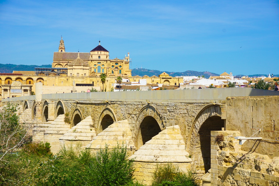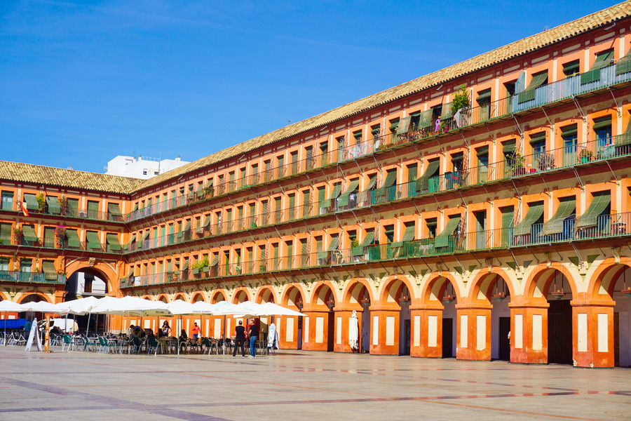 A gauche : le pont romain et la Mezquita à Córdoba, à droite la Plaza de la Corredera également à Córdoba où nous avons finalement vécu cinq mois