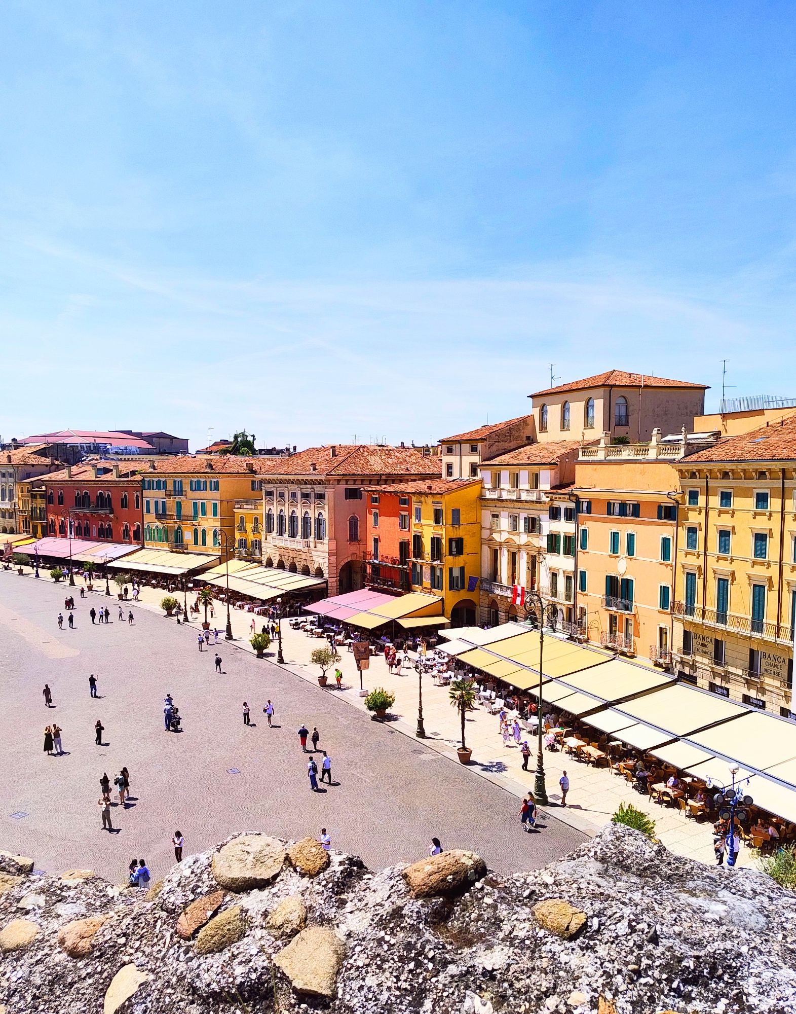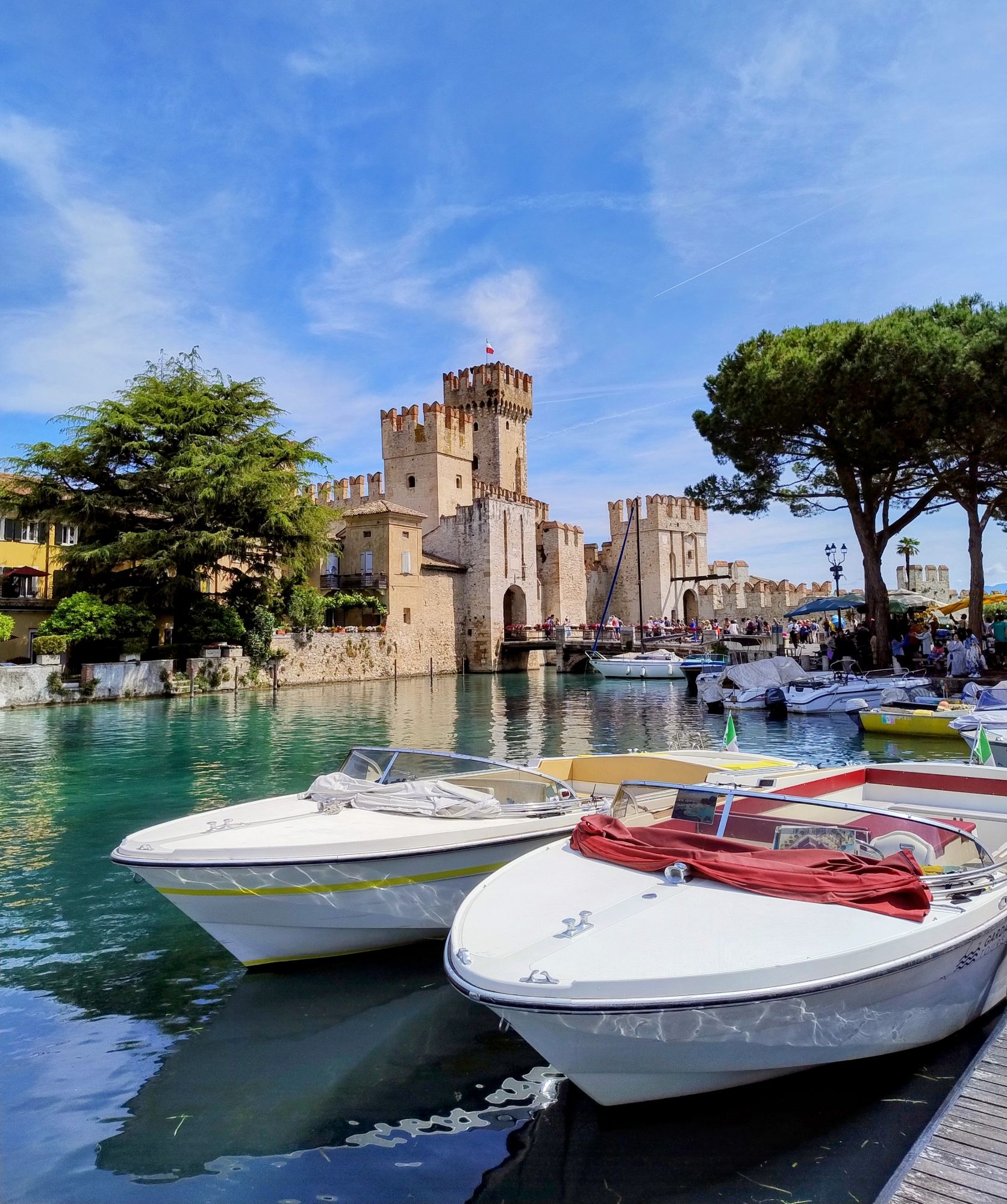 A gauche : le château de Sirmione sur le lac de Garde, à droite : la Piazza Bra à Verona vue depuis le sommet des arènes