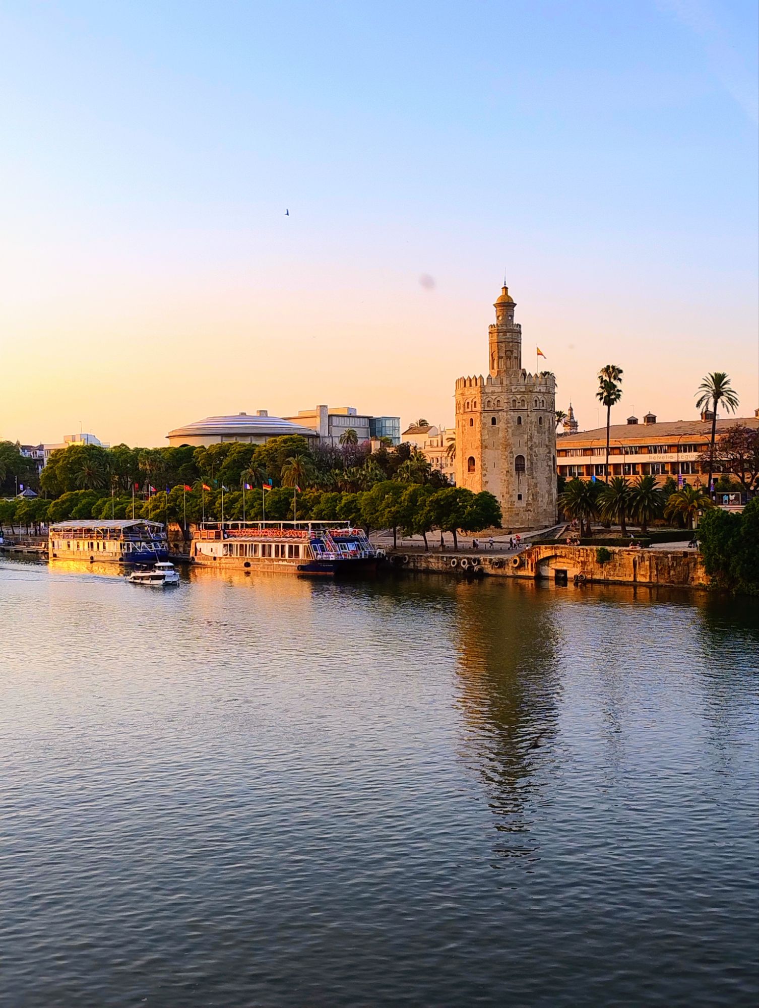 A gauche : coucher de soleil estival sur la Torre de Oro à Séville, à droite, plage de Matalascañas, la plus proche de chez nous