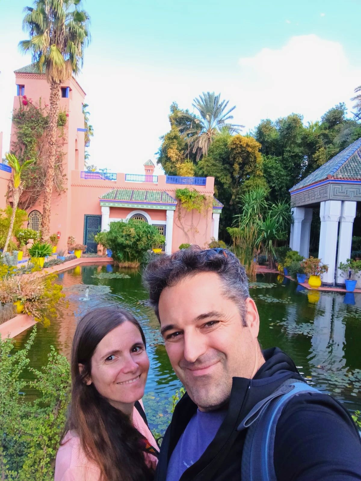 A gauche : les remparts d’Assilah au bord de l’Atlantique, à droite : petit selfie dans le jardin Majorelle à Marrakech
