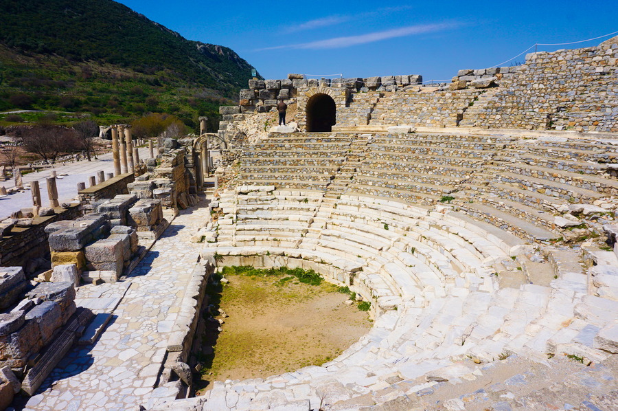 Visiter Pamukkale en pleine saison doit être invivable car blindé de monde mais en hiver, ce ne doit pas être la panacée non plus à cause des bassins à traverser pieds nus. Nous sommes contents que notre passage coïncide avec une chaude journée de printemps. Il n’y a encore pas trop de monde et nous ne risquons pas de perdre un orteil pour cause d’eau glacée.