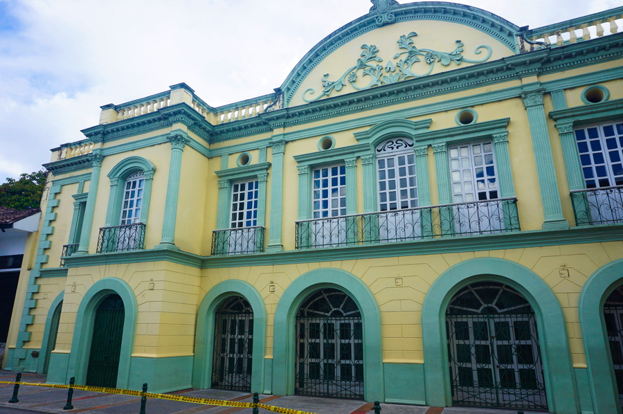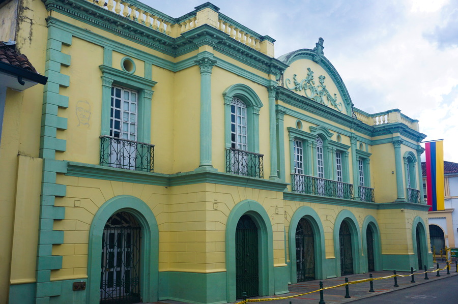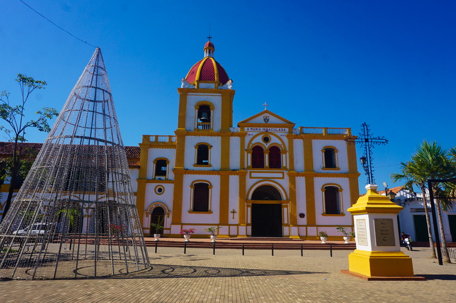 C’est la plus grande et la plus ancienne place de Cartagena. Elle s’appelle ainsi car elle est bordée par le bâtiment de la douane. Donc, si vous débarquez en bateau en Colombie via le port de Cartagena, c’est dans le superbe bâtiment blanc aux arcades qui ressemble à la Plaza Chica de Zafra que vous devrez aller faire timbrer votre passeport. Il y a même une statue de Christophe Colomb qui trône encore sur la place même si en ce mois de décembre, elle est éclipsée par les décorations de Noël. Il faut croire qu’ici on n’en veut pas trop à l’explorateur d’avoir débarqué et entamé le processus infernal de colonisation.